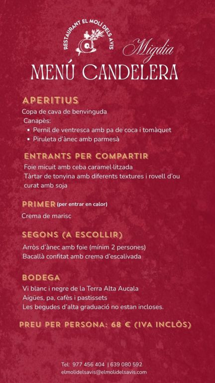 Al Restaurant Molí dels Avis, us hem preparat un menú especial.