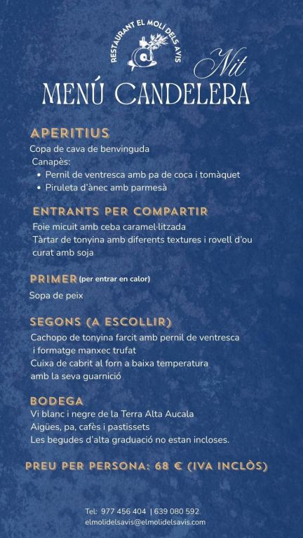 Al Restaurant Molí dels Avis, us hem preparat un menú especial.